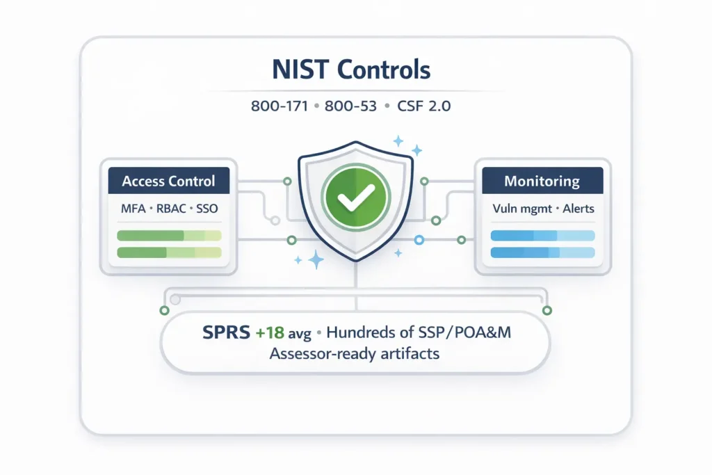 Our NIST compliance consulting implements NIST SP 800-171 Rev. 3 and NIST CSF 2.0 so your SSP, POA&M, and SPRS submission align with DFARS and CMMC Level 2 expectations across on-prem and cloud.
